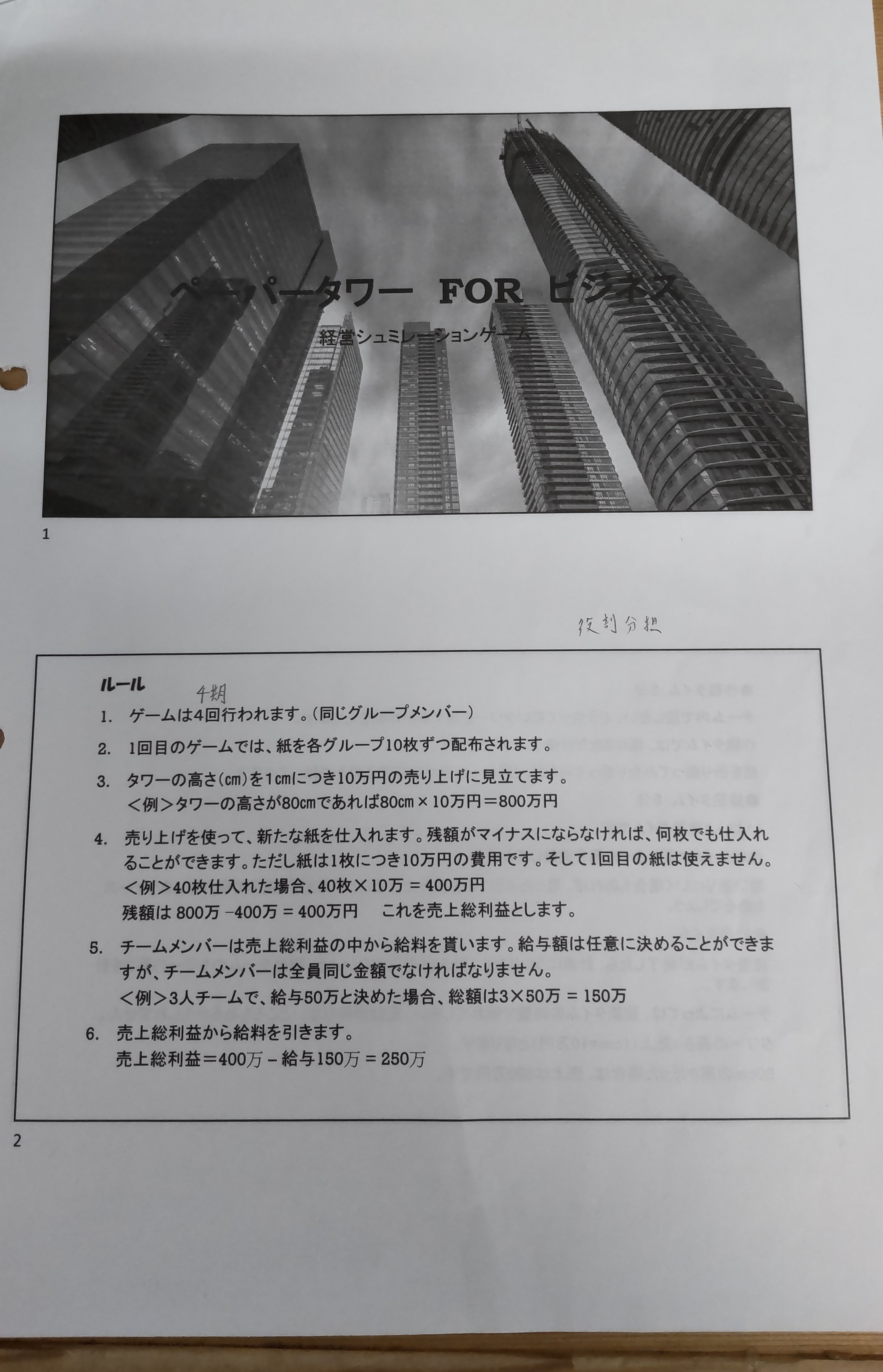 ペーパータワーとは、紙をタワーのように高く積み上げていくゲームです。紙は折り曲げることが可能であるため、グループで話し合いを行い、高さが出るように工夫して形をつくっていきます。高く積み上げていくことに加えて、タワーの高さを売上に見立てて、材料費や給料を計算する必要もあります。